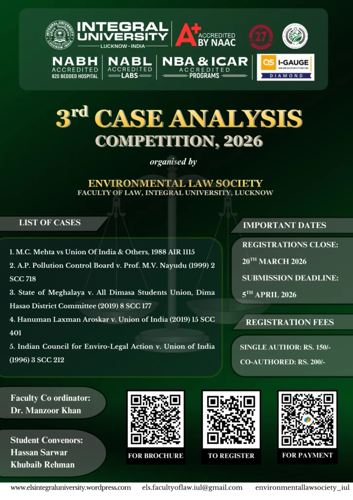 The Environmental Law Society (ELS), Faculty of Law, Integral University, Lucknow is organising the 3rd Case Analysis Competition, 2026.