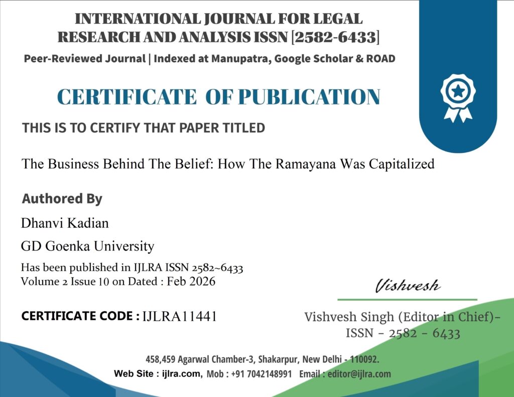 Dhanvi’s winning essay, titled “The Business Behind the Belief: How the Ramayana Was Capitalized By…”, reflects deep academic insight and a powerful blend of legal reasoning with cultural understanding. Her work has recently been published in the International Journal for Legal Research and Analysis (IJLRA), adding another feather to her cap. Having her research featured on such a respected academic platform marks a significant milestone in her academic journey.