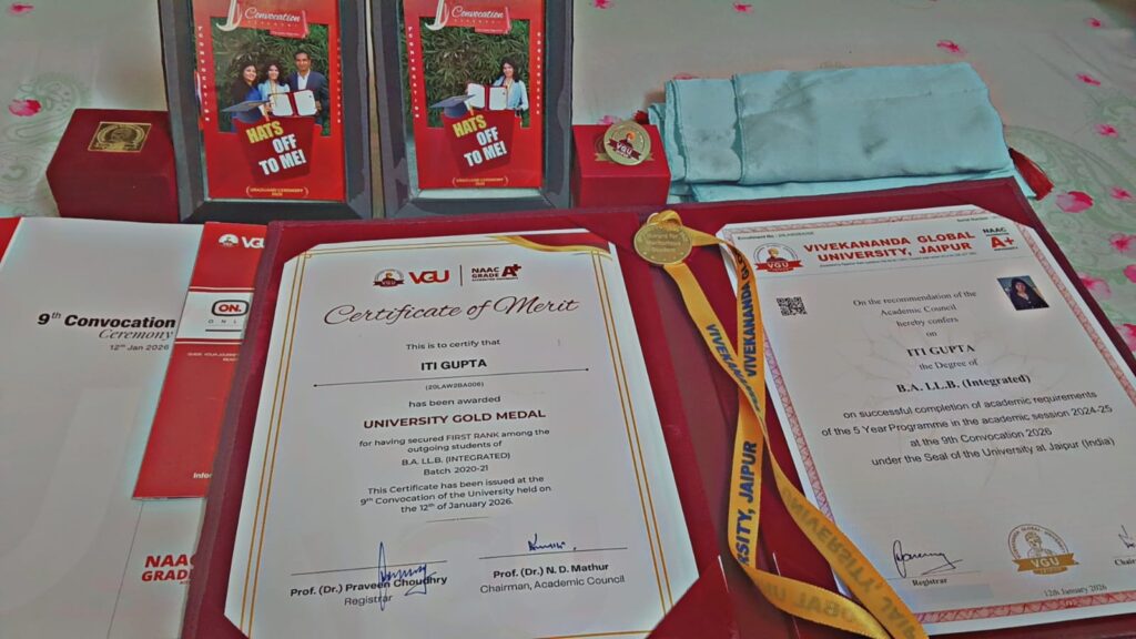 Academic excellence is never accidental. It is the result of dedication, discipline, and an unwavering commitment to growth. At LawFoyer’s Achievers’ Archive, we take immense pride in celebrating such stories that inspire countless young legal minds. One such remarkable achievement is that of Ms. Iti Gupta, who has been awarded the Gold Medal in BA LLB Integrated Course by Vivekananda Global University, marking a milestone of perseverance and academic brilliance.