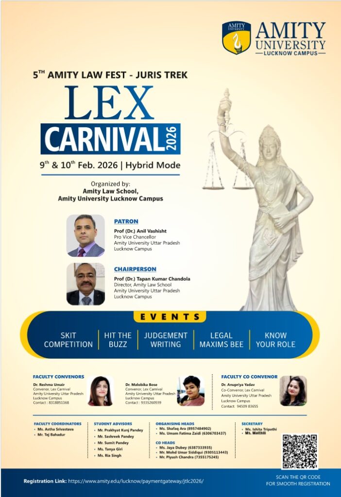 Lex Carnival 2026 is the 5th edition of the Amity Law Fest – Juris Trek and will be held on 9th and 10th February 2026 in Hybrid Mode. It is a multi-event academic and cultural carnival designed to foster knowledge, creativity, analytical thinking, legal awareness, teamwork, and expressive skills. The fest brings together students from various institutions and bridges academic learning with practical and creative expression through diverse competitive events.
