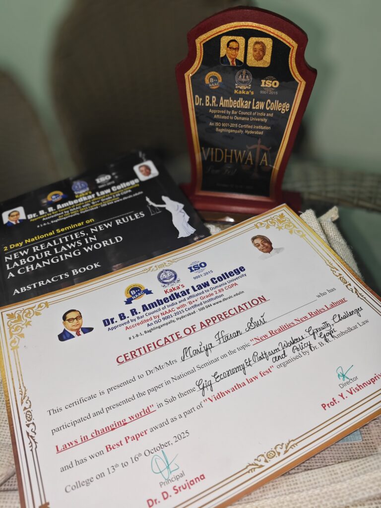 On 16 October 2025, Mariya secured the Best Paper Award at the National Seminar on “New Realities, New Rules: Labour Laws in a Changing World”, organized as part of Vidhwata 2025, the maiden law fest of Dr. B. R. Ambedkar Law College, Hyderabad. Her research paper, titled “Gig Economy and Platform Workers: Growth, Challenges, and Policy Gaps”, captured the attention of evaluators for its clarity, originality, and powerful analysis of one of the most pressing labour law issues of our time.