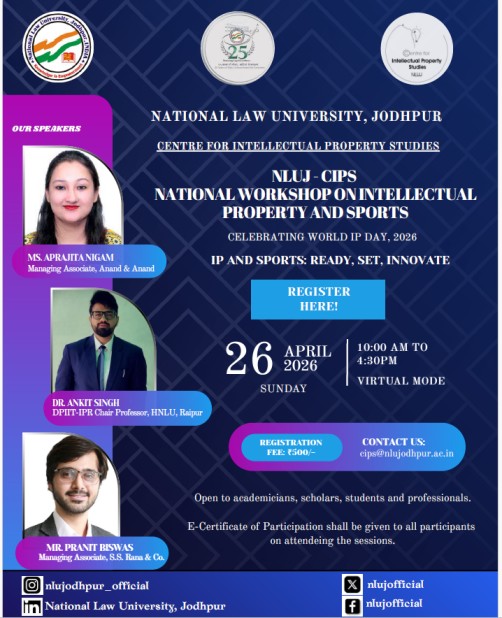 On the occasion of World Intellectual Property Day, the Centre for Intellectual Property Studies at National Law University, Jodhpur is organising a National Virtual Workshop on the theme “Intellectual Property and Sports.” The workshop aims to examine the evolving interface between intellectual property law and the contemporary sports industry, where innovation, branding, and media rights are integral to its growth and governance. In an era marked by the increasing commercialisation of sports, intellectual property rights—ranging from trademarks and copyrights to patents—play a crucial role in safeguarding athletes’ image rights, sports technologies, broadcasting content, and merchandising frameworks. This workshop seeks to provide participants with a nuanced understanding of these dimensions, while engaging with pressing legal and policy challenges in both national and global contexts. Bringing together leading academicians, practitioners, and students from across the country, the workshop aspires to foster informed dialogue on emerging issues such as ambush marketing, personality rights, sports technology innovation, and the expanding role of IP in shaping the business of sports. It endeavours to serve as a platform for critical engagement, knowledge exchange, and interdisciplinary learning in this increasingly significant domain.