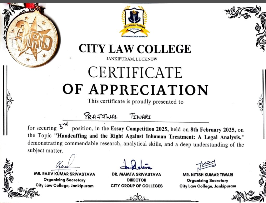 LawFoyer proudly celebrates the academic success of Prajjwal Tiwari, a dedicated law student from City Law College, who secured 3rd Position in the Legal Essay Competition organized by his institution. This achievement stands as a reflection of his growing command over legal research, analytical thinking, and structured legal writing.