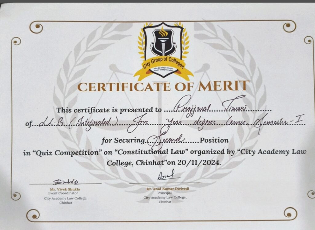 LawFoyer proudly celebrates the academic achievement of Prajjwal Tiwari, a passionate law student from City Law College, affiliated to the University of Lucknow, who secured Second Position in both the Essay Competition and the Constitutional Quiz Competition organized by City Academy Law College, Lucknow, in December 2024. This remarkable accomplishment reflects Prajjwal’s early dedication to legal learning and his commitment to building a strong foundation in constitutional studies and legal writing.