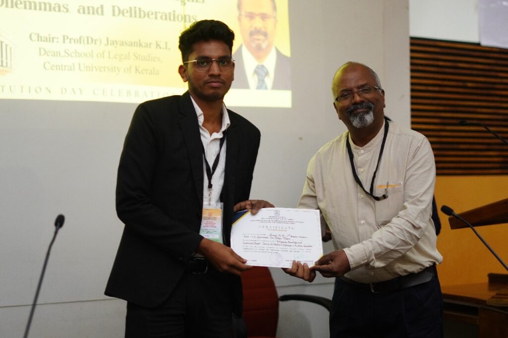 Currently pursuing his BBA LL.B. (Hons.) at Government Law College Thrissur, Sooraj represents the new generation of law students who balance doctrinal learning with research-driven inquiry. His achievement reflects the academic culture of his institution, which encourages students to explore beyond textbooks and actively participate in scholarly platforms. It also underscores the importance of national conferences as spaces where young legal minds can present ideas, receive feedback, and contribute to ongoing constitutional discourse.