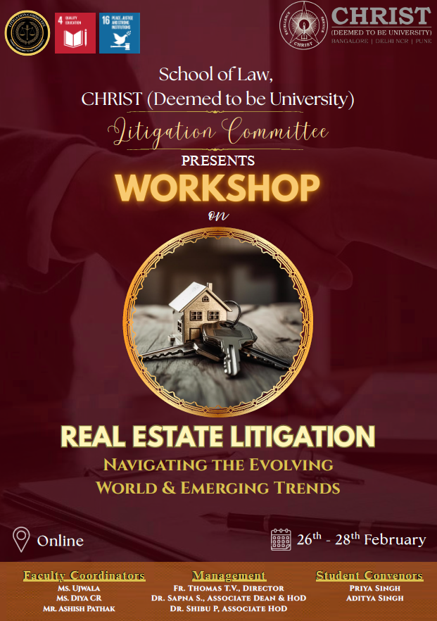 The Litigation Committee of the School of Law, CHRIST (Deemed to be University), Bangalore, is hosting a Workshop on Real Estate Litigation: Navigating the Evolving World & Emerging Trends. The workshop aims to provide participants with practical insights into the rapidly developing landscape of real estate law and dispute resolution.