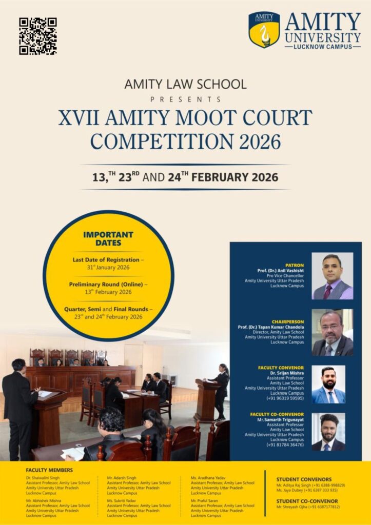 XVII AMITY MOOT COURT COMPETITION 2026 | Organized by The Moot Court Committee of Amity Law School, Amity University Uttar Pradesh, Lucknow Campus | Register by 31st January 2026